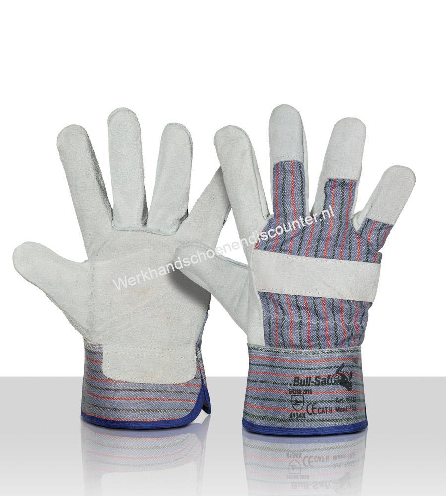 Werkhandschoen splitleder Amerikaantje met palmversterking en 6 cm kap, rood blauw streepdoek